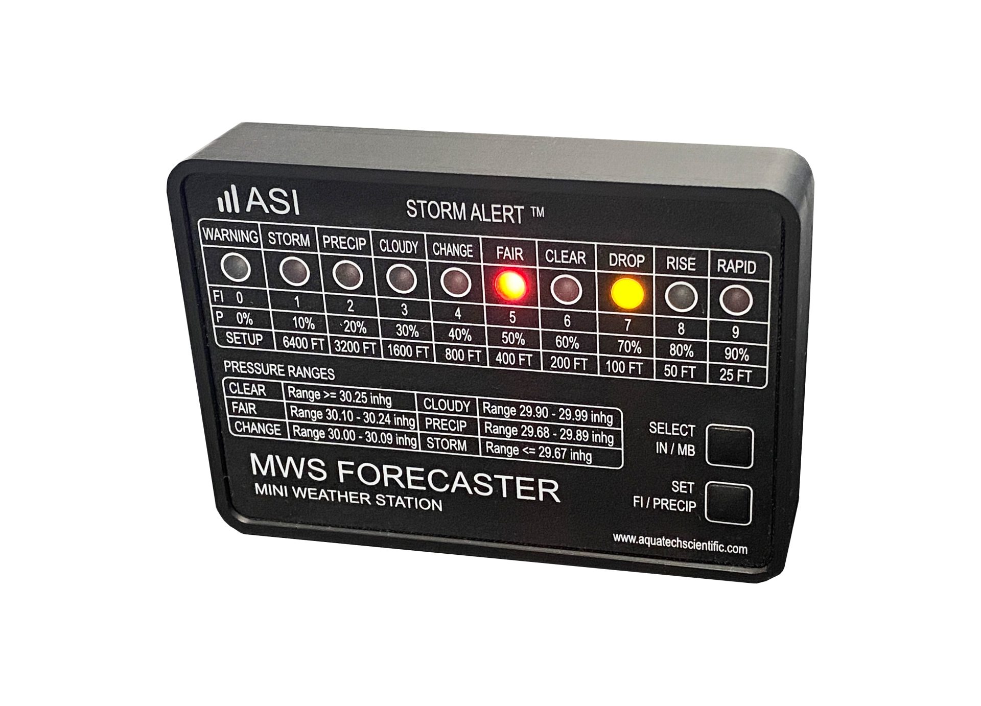 The “Mini Weather station” is a new precision barometer from ASI. Using a Bosch precision pressure sensor and pressure sensing algorithms the Mini Weather station is an excellent weather alert system. Setup is as simple as entering your elevation and the Mini Weather Station does the rest. The unit provides updated predictions every 5 minutes and the unit will indicate 1 of 6 weather conditions: Storm, Precip, Cloudy, Change, Fair, or Clear. If the conditions are changing then the next LED will start blinking, letting you know which way the weather is heading! Pressing the “SELECT” Button will display the current real-time pressure reading one digit at a time in both InHg and Mb. Pressing the “SET” button will display the “Current Forecast Index” and then the “Chance of Precipitation” based on the last 60 pressure records!